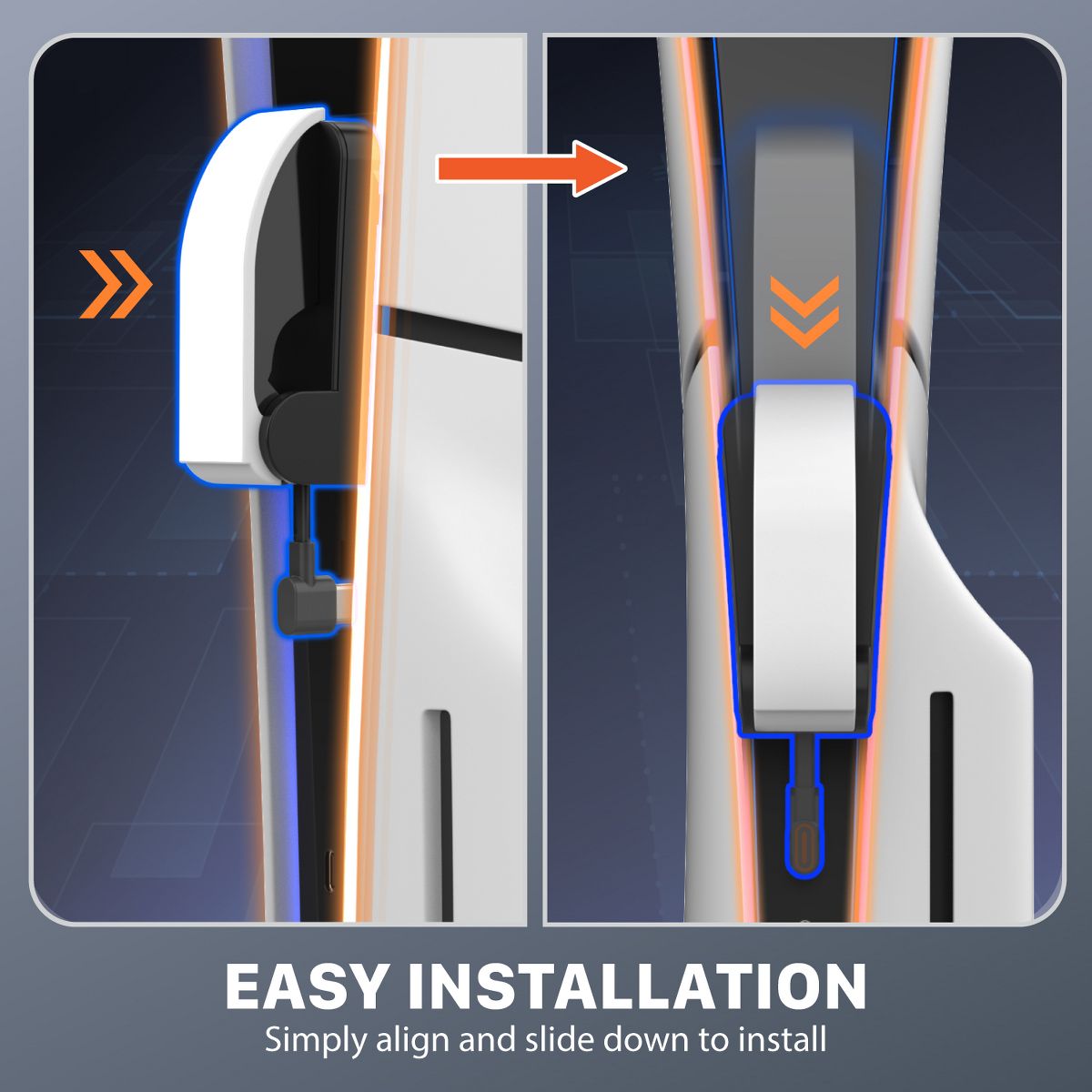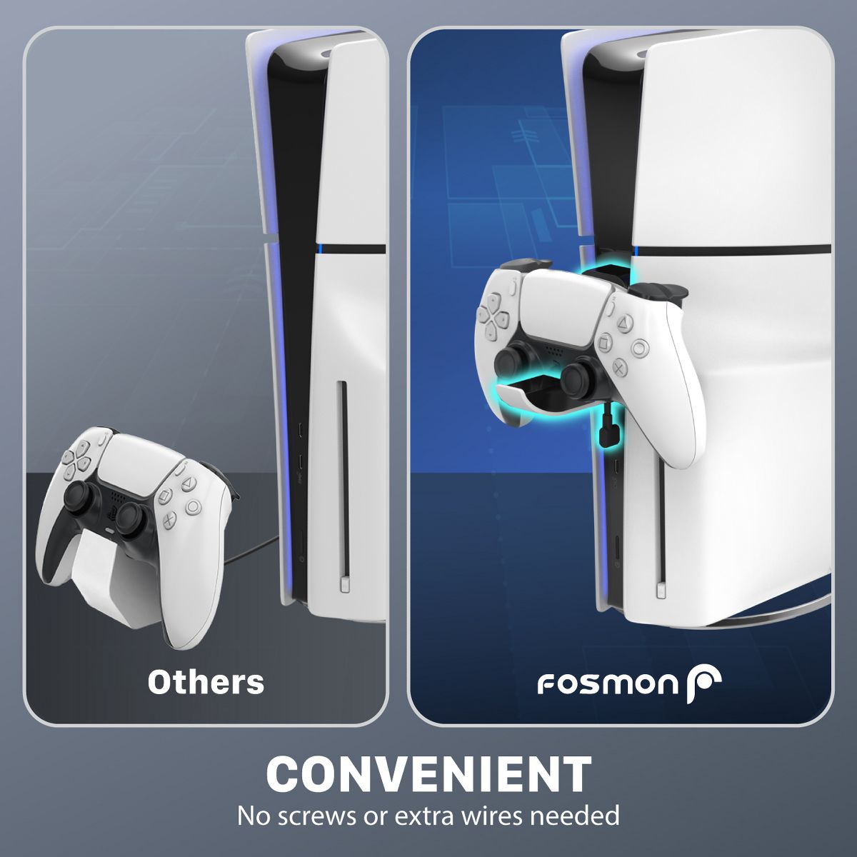 Fosmon’s PS5 Slim mini charging controller is easy to install. Simply line up the charging controller holder to the front side of your PS5 Slim and simply slide it down to the appropriate length and connect the USB-C cable. Fosmon eliminates screws and the drilling process to make the installation easy, simple and efficient. No more finding a proper surface and pulling out your drill to drill holes. Compatible with PS5 Slim Disc and PS5 Slim Digital.