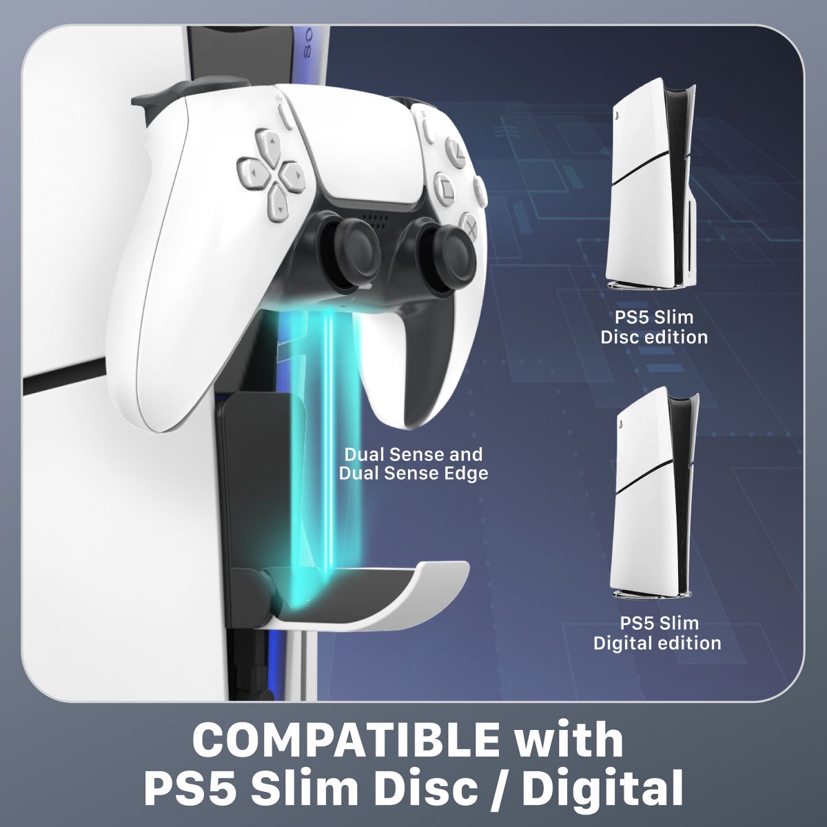 Our PS5 Slim mini charging controller holder is built for both versions of the PS5 Slim. It is compatible with both the PS5 Slim Disc version and the PS5 Slim Digital version. The charging controller holder also supports not just the regular PS5 DualSense controllers, but also the PS5 DualSense Edge controllers. Make charging simpler and save more space with our mini charging controller holder. Built with the focus on balancing practicality and efficiency.