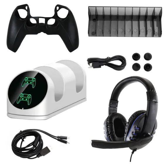 10 in 1 Accessories Pack is designed to protect and use the game controllers or console perfectly. There is a:Dual Charging Dock, Micro USB Cable, Silicone Case, 2in1 Micro USB Cable, 4 Thumb Grips, Storage Stand and Wired Headset.