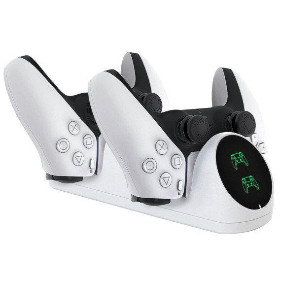 The GameFitz PlayStation 5 Dual Charging Dock allows you to charge two controllers at once. This dock comes with a USB charging cable for convenient charging and the front screen lights up when controllers are docked and charging. Compact size is perfect for small spaces and allows you to both store and charge your controllers simultaneously.