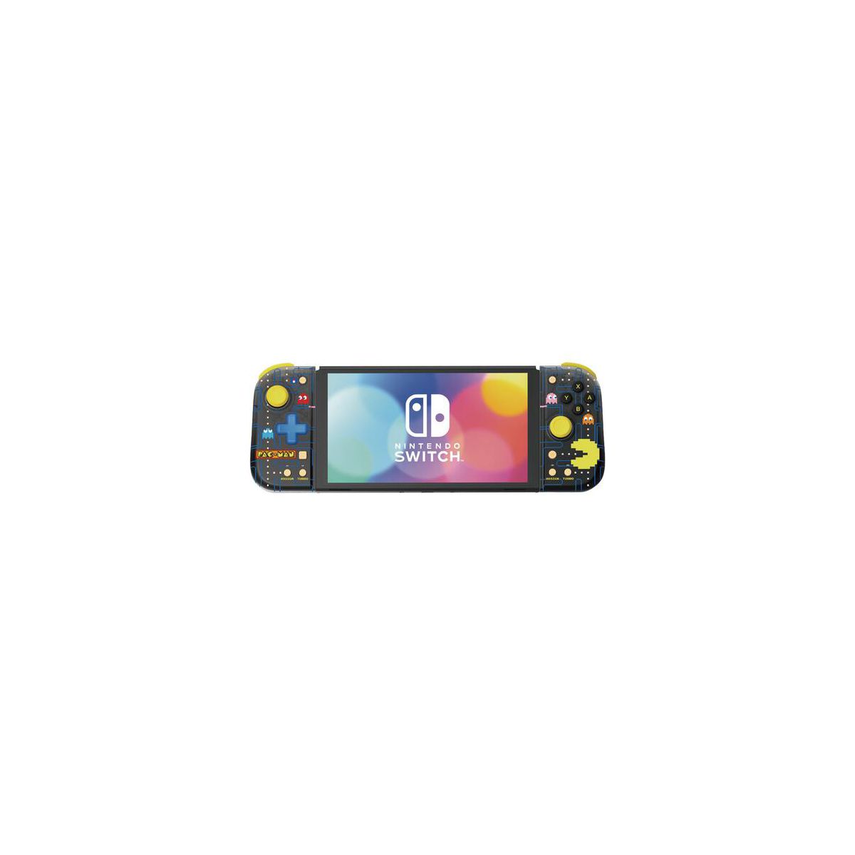 The Split Pad Compact attaches to the Nintendo Switch™ system to provide a full-size controller experience in Handheld Mode. The ergonomic form factor fits your hands perfectly for increased comfort and control. Features include full-size analog sticks and D-pad, turbo functions, and assignable rear buttons. Now featuring retro PAC-MAN artwork. Enjoy a new gaming experience with the Split Pad Compact! (Does not include Motion Controls, HD Rumble, NFC, or IR camera.) Officially Licensed by Nintendo® and Bandai-Namco.
