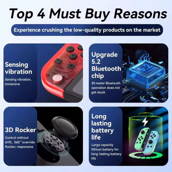 This Wireless Switch Controller is a high-performance gamepad engineered to elevate your gaming experience across Nintendo Switch, Switch Lite, and Switch OLED consoles. Designed with precision and comfort in mind, it features responsive dual vibration motors that deliver immersive, scene-specific haptic feedback, bringing every in-game action—from collisions to combat—to life.