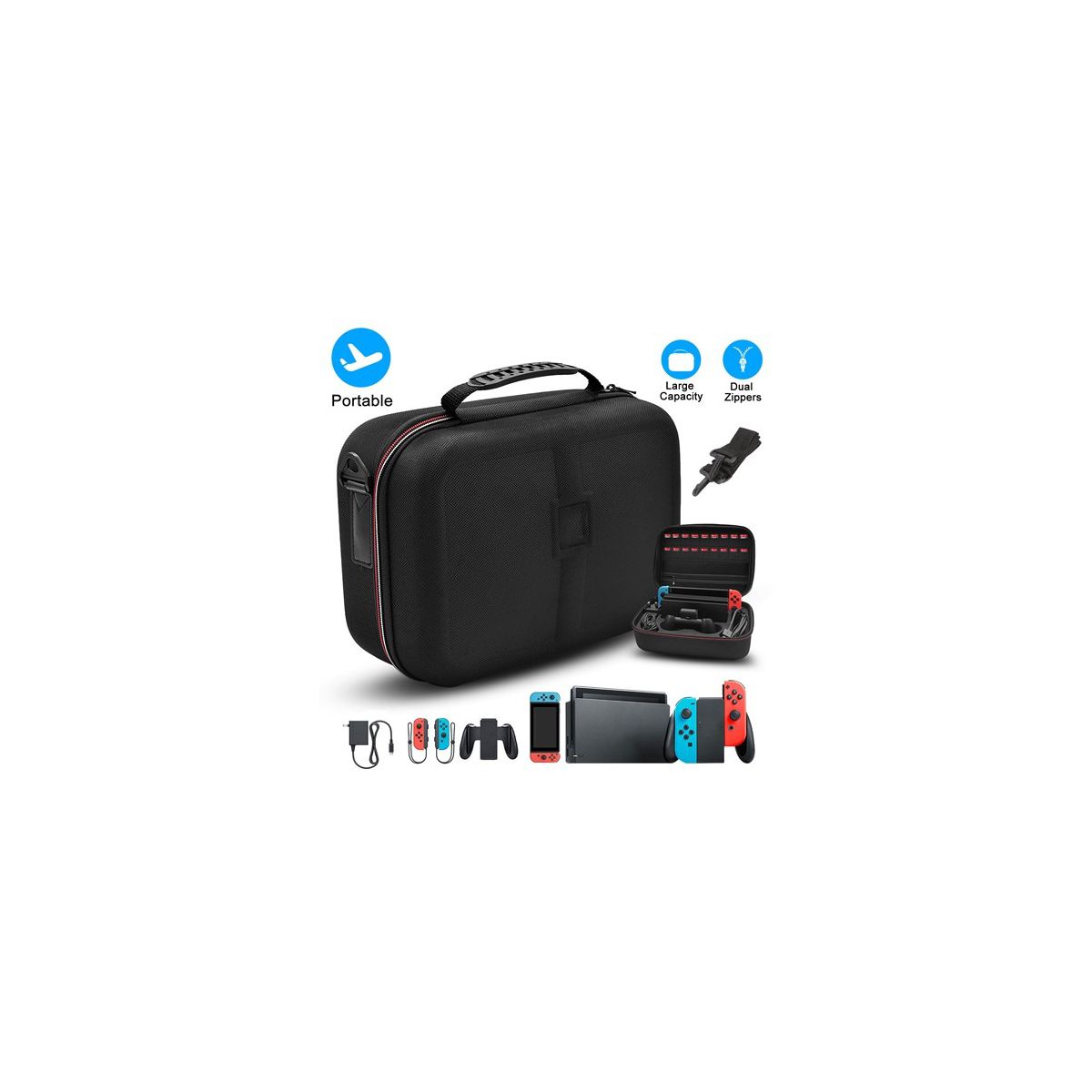 *Features:* **MULTIPLE STORAGE CASE*: Features with plenty of independent storage compartments to hold the entire Nintendo Switch system,including a Joy-Cons,a Pro Controller,a Nintendo Switch Dock,a Joy-Con Charging Grip,AC Adapter and the Interior mesh pocket for other smaller accessories,like extra Joy-Cons,HD Cable,Joy-Con straps etc. Moreover,its visible 18 game cartridges for game cards or memory cards. **ABSOLUTE PROTECTION*: Hard EVA shell provides excellent protection from any bumps,shocks,drops,impacts,scratches,dust,dirt,moisture,water and etc. Keeps all components secured and protected. The soft interior liner provides grooved compartments to keep accessories separated from scratching or rubbing against each other. **DELUXE TRAVEL CARRING CASE*: Adopts high-grade EVA and Oxford cloth materials with exquisite workmanship,makes it look fashionable and deluxe. Rubberized handle,adjustable shoulder strap,compact lightweight structure make travel very friendly whether you are going on trip/ vacation,on outdoor adventures,etc. **HANDLE & SHOULDER STRAP*: Comes with a slight-elastic adjustable shoulder strap and rubberized handle,offering carrying ways to makes the storage case more portable. **DURABLE DOUBLE LARGE ZIPPERS*: The unique dual large zipper design works great and goes all the way around the case,making it easier to open and close,conveniently gets what wants. *Specifications*: Brand: iMounTEK Materials: EVA shell, Oxford cloth Function: Storage case for Nintendo Switch and accessories The length of Shoulder Strap: 116cm/3.8ft Available colors: Black Item Size: 29.5*23.5*13cm/11.6*9.25*5.1in Item Weight: 655g/1.44lbs Package Size: 30*24*12cm/11.81*9.45*4.72in Package Weight: 774g/1.71 lbs *Package Lists*: 1 x Storage Case 1 x Shoulder Strap