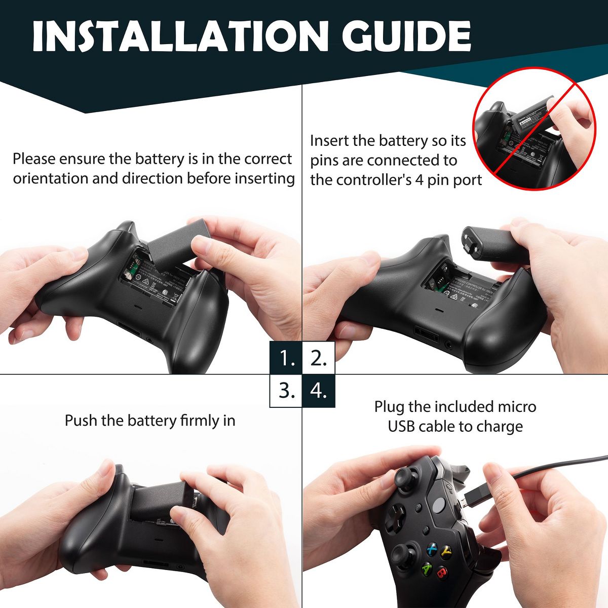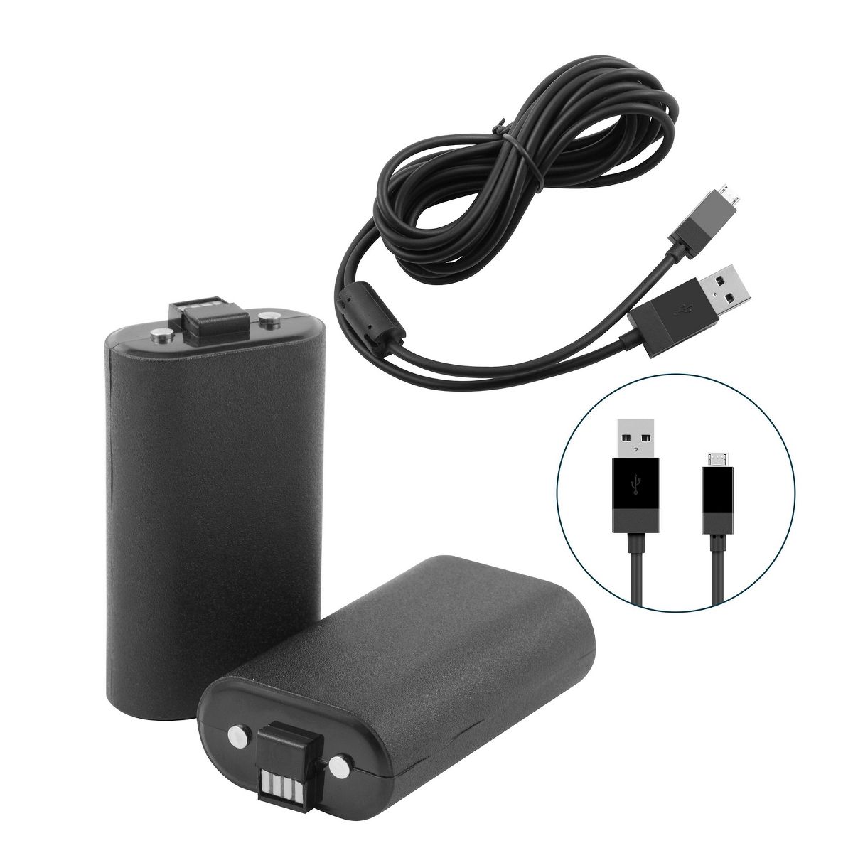Switch to the convenience of rechargeable batteries. No more finding or buying AA batteries when your controller runs out of power. These rechargeable batteries are the most cost-effective way to keep your controllers running. Huge 1600mAh battery capacity will provide up to 10 hours of gaming on a single full charge. Never run out of power during tense situations!. Easily recharge the batteries through the included micro USB cable. Super long 9-foot charging cable provides better user convenience. Fully charge the batteries in less than 4 hours. Efficient and stable charging supply with overcharge protection. Continue gaming while the controller is plugged and charging. Use your console, AC adapter, power bank or computer to provide a power supply. Recharge the battery over 1000 times. LED indictor located on the micro USB cable will show the charging status of the battery. Red: Charging; Green: Charged. The charging status and remaining battery capacity will be shown on the Xbox dashboard. CE and RoHS certified for guaranteed user and device safety. Compatible with al Xbox One controllers. Includes: Xbox One, Xbox One S, Xbox One X and Xbox One Elite. Package Includes: 2 x 1600mAh Rechargeable Batteries, 1 x Micro USB to USB Charging Cable. Note: Please ensure that the battery is in the correct orientation and direction before inserting into your controller. Note: Not for Xbox 360 or Xbox (1st Generation) Controllers. Color: Black.