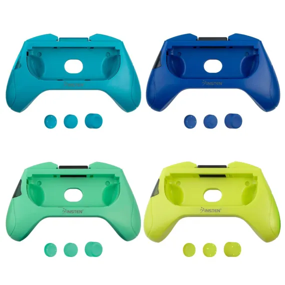Expand your video game accessories collection with these controller grips, designed to be compatible with the Nintendo Switch Joy-Con controllers. Each controller grip can snugly and securely hold either the left or right Joy-Con controller in a familiar form more suited to people with larger hands, helping prevent unnatural angles and the hand and finger cramping that can result during long gameplay sessions. The shoulder triggers extend to activate the triggers on the Joy-Con, while the included controller thumb grips make it easier to grip and control the joystick. Each controller grip has a comfortable, slip-resistant matte finish that makes it easier to grip than controllers with smooth finishes. These controller grips come in Blue, Dark Blue, Turquoise, and Neon Yellow colors designed to match those of the stock Joy-Con controllers. This product is intended for use by persons 13 years of age and older.