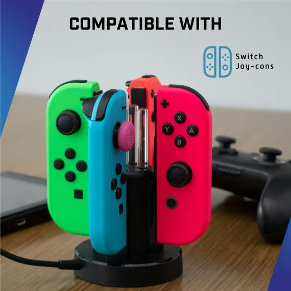 Compatible with Nintendo Switch (2017) and Switch OLED Model (2021). Charge up to 4 controllers simultaneously with this functional display stand and charging station, compatible with Nintendo Switch and OLED Model Joy-Cons. With a quick 3.5-hour charge time, you can efficiently power up all your controllers, ensuring they are ready for extended gaming sessions. The smart lamppost LED indicator provides clear visuals for your controller's charging status, emitting a red glow while charging and turning green when fully charged. The precise slide-in design allows for easy insertion of your controllers, securely docking them with a simple downward slide. The anti-slip pad on the base prevents any slipping or sliding during charging, while the lightweight and portable design makes installation a breeze. Not only does this charging dock keep your Joy-Con controllers organized, but it also serves as a stylish display stand to showcase your favorite controllers on your gaming desk. Present your controllers in a sleek and organized manner when they are not in use. This charger dock is the perfect gift for Nintendo Switch gamers, ensuring that their controllers are always charged and ready for gaming, providing the convenience they need to enjoy uninterrupted game time.