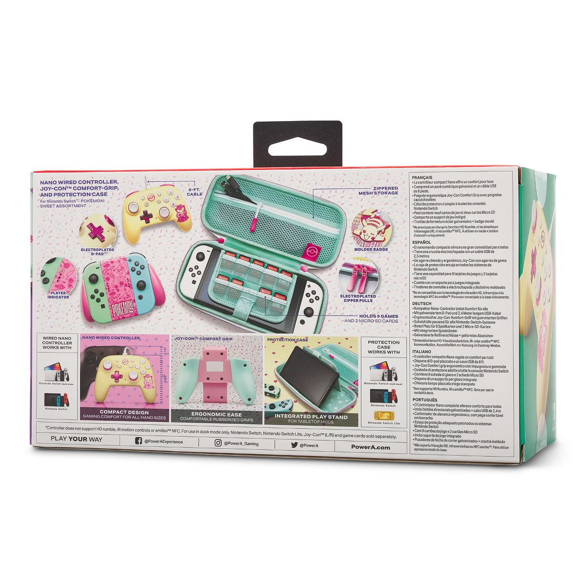 The officially licensed PowerA Pokémon: Sweet Assortment for Nintendo Switch includes a Joy-Con Comfort Grip, Nano Wired Controller and Protection Case, all featuring your favorite Pokémon characters: Eevee, Jigglypuff, Pichu and Pikachu! The Joy-Con Comfort Grip turns a set of Joy-Con into an ergonomic controller with comfortable rubberized grips. The Nano Wired controller offers standard-size controls in a compact, portable package for players of all sizes, and includes an 8 ft. micro-USB cable. The sturdy Protection Case provides secure storage for 9 game cards and is compatible with any Nintendo Switch device. The case also features a built-in play stand for playing in Tabletop Mode.