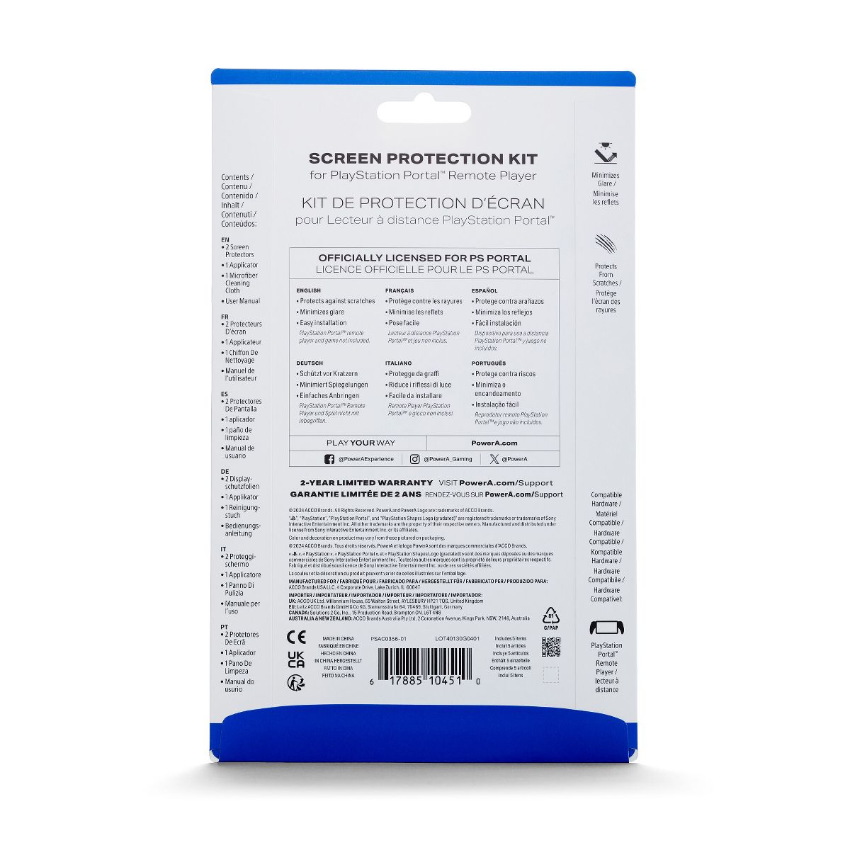 Keep the screen on the PlayStation Portal™ Remote Player protected with the officially licensed PowerA Screen Protection Kit for PlayStation Portal™ Remote Player. The durable screen protector helps prevent scratches and minimizes glare so you can enjoy gaming indoors or outdoors. Simple application only takes a few minutes. Includes 2 screen protectors, 1 microfiber cleaning cloth, and applicator for proper installation. 2-Year limited warranty.