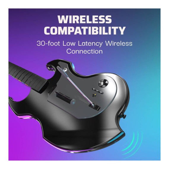 Enjoy elevated comfort and convenience with a 30-foot low latency wireless connection, a built-in, rechargeable battery for up to 36-hours of play per charge, shoulder strap, and patented analog stick. Turn it up to 11 with the 3.5mm audio jack, and adjust volume on-the-fly with the audio controls located on the D-pad. The guitar is also collapsible allowing you to pack it for your next tour or safely store at home. PDP's RIFFMASTER is officially licensed by Xbox and compatible across Xbox Series X|S, Xbox One, and Windows 10/11.