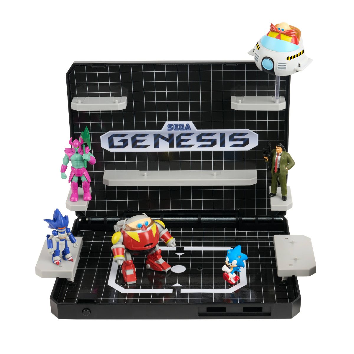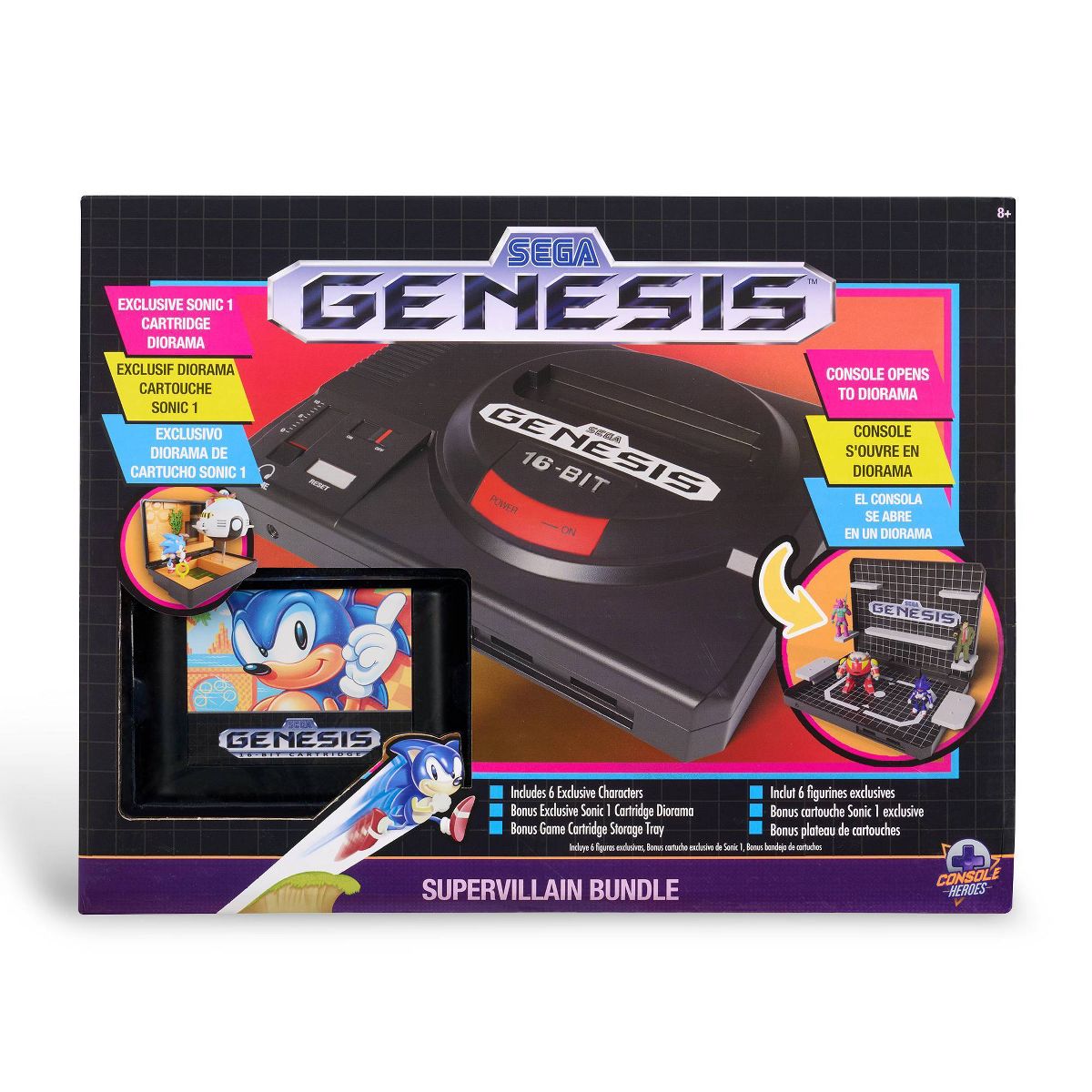 The ultimate collector’s centerpiece! The Console Heroes Supervillain Boss Bundle brings retro gaming glory to life in 3D. Styled after the iconic Sega Genesis console, it flips open to reveal shelving and gridline deco sticker graphics designed to display Mecha Robotnik, Mecha Sonic, Mr. X, and Death Bringer, with room to showcase the rest of your Console Heroes collection. It also includes the exclusive Sonic the Hedgehog 1 diorama cartridge, recreating Sonic’s battle with Eggman’s Eggmobile in Labyrinth Zone—only available in this bundle.