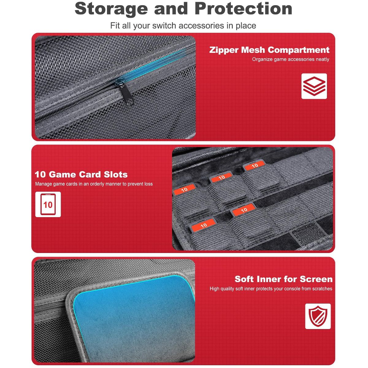The carrying switch case for kid ,adult and Mario fans also the front buttons are a cute addition which is the perfect size to keep everything together and prevent the game cartridges lost, very durable and wonderful quality, thick enough and don't have to worry about the screen cracking.it designed with a high-quality nylon zipper head which can prevent your precious switch from dropping out or scratching. The travel switch case with a sturdy strap can storage your Nintendo Switch securely stored when traveling or daily using. This switch storage case allows Nintendo Switch game players storing and organizing their favorite accessories easily.