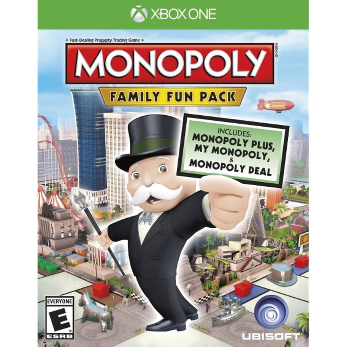 A new era of Monopoly for home consoles! Wheel and deal your way to victory, and take the coveted Boardwalk property, in the Hasbro board game classic with Monopoly: Family Fun Pack from Ubisoft for the Microsoft Xbox One.Family Fun Pack gathers the 3 Monopoly Games: Monopoly PLUS: the classic Monopoly with a 3D animated board, My Monopoly: create your very own board, and Monopoly Deal: a fast-paced and addictive Monopoly card-game!Embark on a journey to own it all! Use your tablet or mobile device to experience the fun in an all new way. You can mange your properties or keep track of your money straight from your second screen!Experience your favorite game in three unique, new ways! Enjoy the classic Monopoly with your family, friends and people all around the world!Features:Play online with up to 6 players.Includes 3 Monopoly games: Monopoly PLUS, My Monopoly and Monopoly Deal!Access the Hasbro Game Channel from your console for even more great Hasbro games.Use your tablet or mobile device to manage your properties or keep track of your money straight from your second screen.