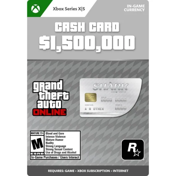 Purchase the Great White Shark Cash Card (Xbox Series X|S) to gain GTA$1,500,000 to spend in the Xbox Series X|S version of GTA Online.