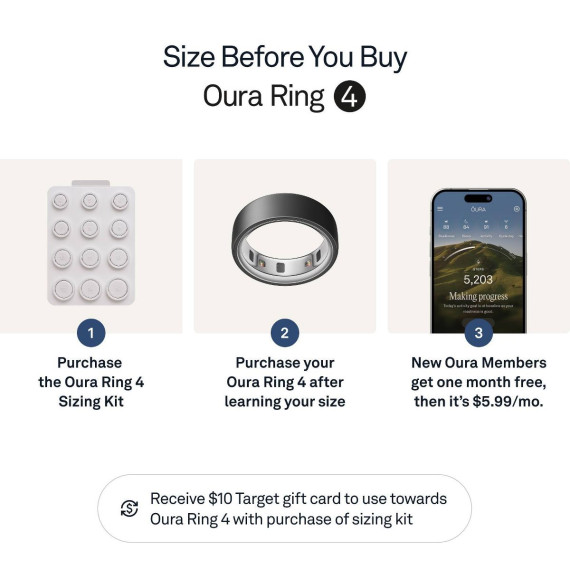 Oura Ring sizes are different from standard ring sizes. It’s important to find your size before you purchase Oura Ring 4. Find your size by purchasing an Oura Ring 4 Sizing Kit on Target.com.