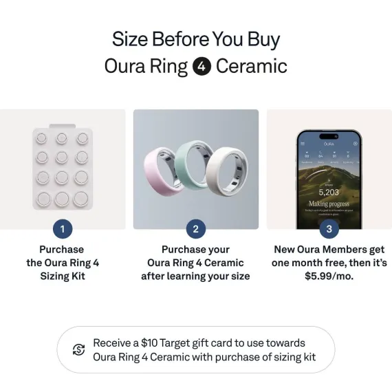 Oura Ring sizes are different from standard ring sizes. It’s important to find your size before you purchase Oura Ring 4 Ceramic. Find your size by purchasing an Oura Ring 4 Sizing Kit on Target.com.