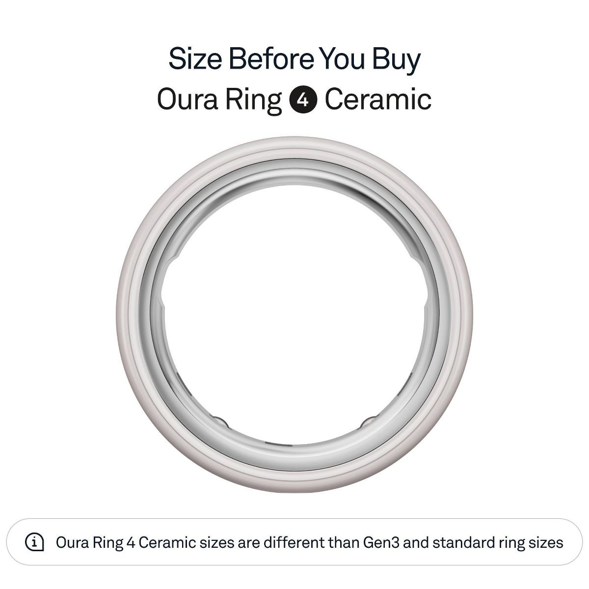Oura Ring sizes are different from standard ring sizes. It’s important to find your size before you purchase Oura Ring 4 Ceramic. Find your size by purchasing an Oura Ring 4 Sizing Kit on Target.com.