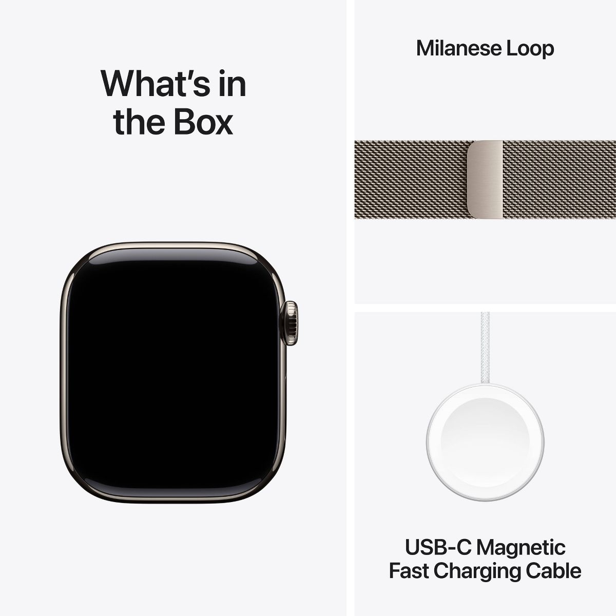 ⁵Charge times are from 0–80% and 0–100% using the included Apple Watch Magnetic Fast Charger to USB-C Cable. Testing conducted by Apple in August 2024 using preproduction Apple Watch Series 10 (GPS) and Apple Watch Series 10 (GPS + Cellular), each paired with an iPhone; all devices tested with prerelease software, Apple Watch Magnetic Fast Charger to USB-C Cable (Model A2515), and Apple 20W USB-C Power Adapter (Model A2305). Fast-charge testing conducted with drained Apple Watch units. Times measured from the appearance of the Apple logo as the unit started up. Charge time varies with region, settings, and environmental factors; actual results will vary.