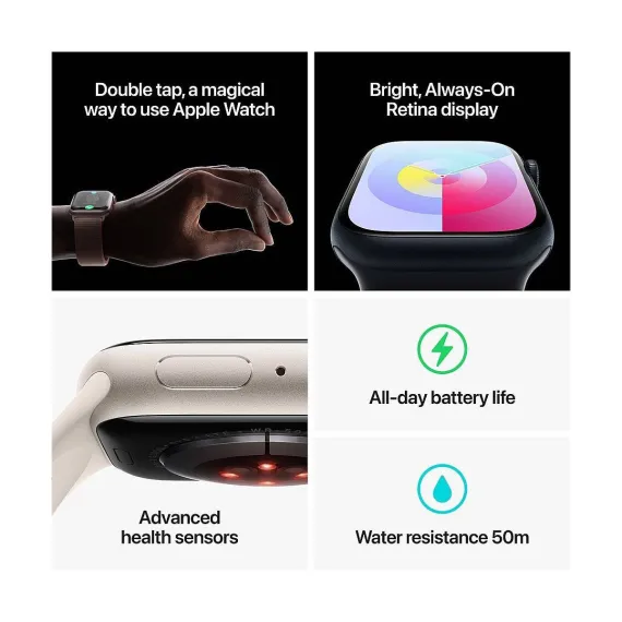 Apple Watch Series 9 helps you stay connected, active, healthy, and safe. Featuring double tap, a magical way to interact with Apple Watch, ¹ an even-brighter display, faster on-device Siri, and Precision Finding for iPhone. ²