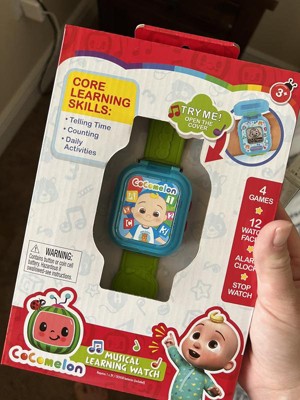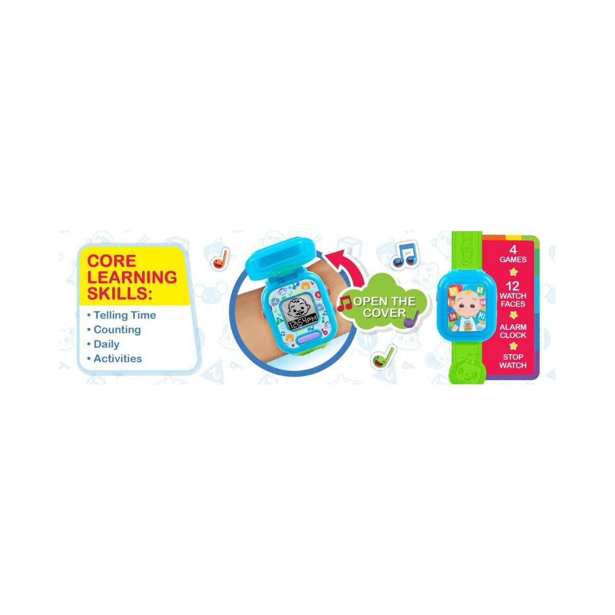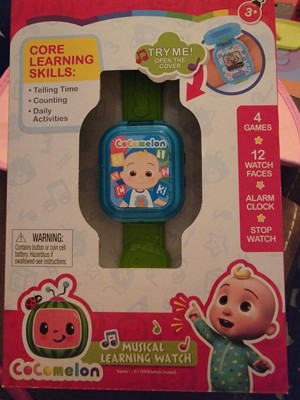 Little preschoolers can always count on JJ with the CoComelon JJxe2x80x99s Learning Watch. Inspired by the hit educational YouTube Kids and Netflix series, CoComelon, this interactive toy watch allows children to engage in their own early learning adventures with JJ wherever they go. Help spark your childxe2x80x99s creativity while discovering core learning and developmental skills through play. Children can start their day off with a friendly wakeup call from JJ! Featuring an alarm clock, stopwatch, animated character watch faces, and fun learning games, kids will love learning how to tell time, count, and accomplish daily activities as they receive reminders throughout the day. This learning watch is great for teaching your child time management skills and features three fun games including Count the Stars, Catch the Bones, and What Animal Makes What Sound? Toddlers will love popping open the cover and customizing their watch with the 12 different animated characters. It even features a kid-friendly, chunky design and stylish band that can be personalized to fit securely around little wrists. This play watch is great for developing fine motor skills, encouraging reading and talking, cognitive learning, social emotional skills and creativity through imaginative play. Featuring an authentic smart watch design, children will feel like a real grown up as they play and learn with JJ whenever they go! Bring home the CoComelon JJxe2x80x99s Learning Watch as well as the rest of the CoComelon toys and block construction sets to help make your little learner Happy & Smart! Requires 1 x CR2450 battery (included). Ages 3+