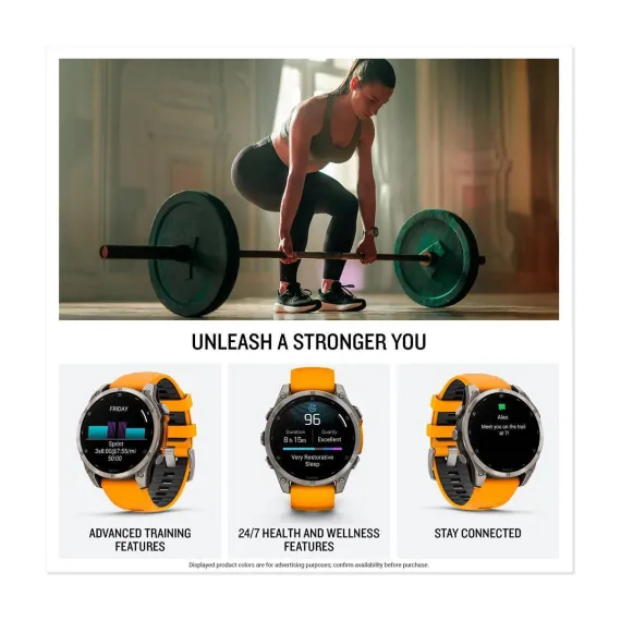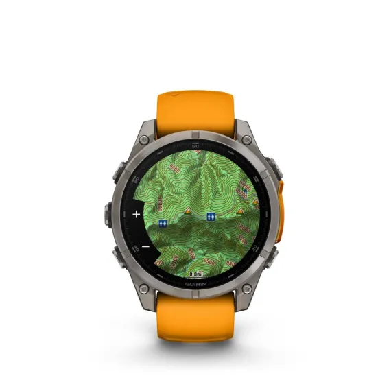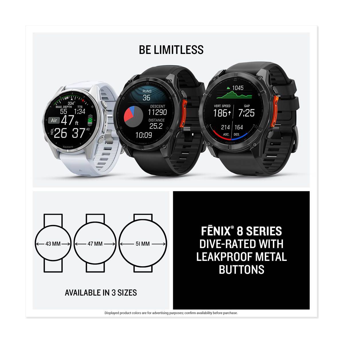 Be limitless. The fēnix® 8 multisport GPS smartwatch is built for serious athletes and outdoor adventurers who want to push beyond their limits. It features a bright 1.4” AMOLED display, stainless steel bezel and powerful built-in LED flashlight for after-dark visibility. A built-in speaker and mic enable you to make and take calls from your wrist when your watch is paired to your smartphone. Power up your body’s performance, endurance and resistance to injury with the latest in targeted strength training plans plus a full range of sport-specific workouts. Performance insights help manage your exertion and build stamina, while training readiness features show how much recovery time you need between workouts, based on 24/7 health and wellness monitoring of heart rate, respiration, stress, sleep and more (data presented is intended to be a close estimation of metrics tracked). Take to the trails with built-in ABC sensors and TopoActive maps that can be easily downloaded via Wi-Fi® connectivity. The dynamic round-trip routing feature helps simplify the planning of your runs or rides — letting you set your target distance and receive turn-by-turn directions that adjust to get you back to your start on schedule. Enjoy extended off-grid adventures with up to 16 days of battery life in smartwatch mode. Plus, a 40-meter dive rating and leakproof metal buttons let you reach new depths of adventure. Additional features include music storage, Garmin Pay™ contactless payments (with a supported country and payment network), smart notifications (compatible smartphone required) and more.