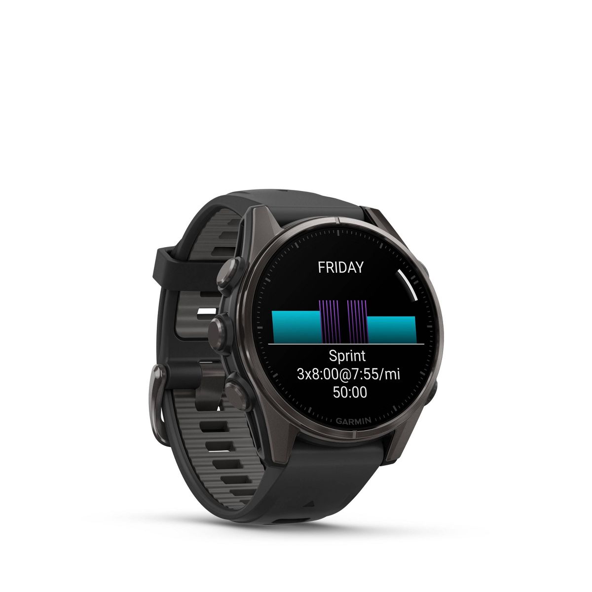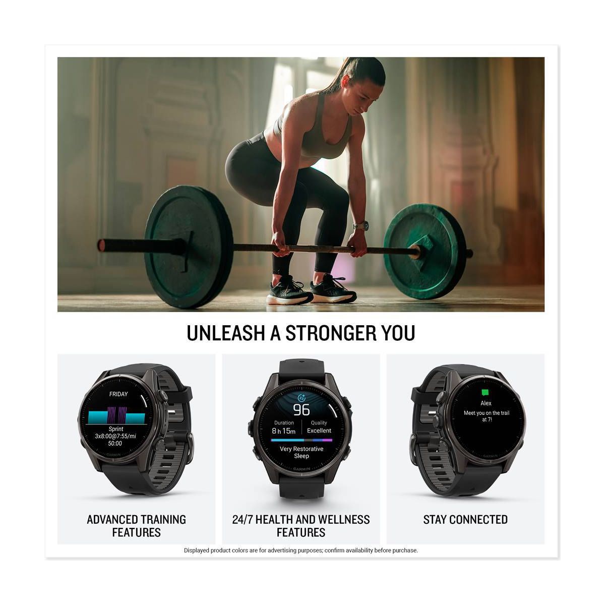 Be limitless. The fēnix® 8 multisport GPS smartwatch is built for serious athletes and outdoor adventurers who want to push beyond their limits. It features a bright 1.4” AMOLED display, stainless steel bezel and powerful built-in LED flashlight for after-dark visibility. A built-in speaker and mic enable you to make and take calls from your wrist when your watch is paired to your smartphone. Power up your body’s performance, endurance and resistance to injury with the latest in targeted strength training plans plus a full range of sport-specific workouts. Performance insights help manage your exertion and build stamina, while training readiness features show how much recovery time you need between workouts, based on 24/7 health and wellness monitoring of heart rate, respiration, stress, sleep and more (data presented is intended to be a close estimation of metrics tracked). Take to the trails with built-in ABC sensors and TopoActive maps that can be easily downloaded via Wi-Fi® connectivity. The dynamic round-trip routing feature helps simplify the planning of your runs or rides — letting you set your target distance and receive turn-by-turn directions that adjust to get you back to your start on schedule. Enjoy extended off-grid adventures with up to 16 days of battery life in smartwatch mode. Plus, a 40-meter dive rating and leakproof metal buttons let you reach new depths of adventure. Additional features include music storage, Garmin Pay™ contactless payments (with a supported country and payment network), smart notifications (compatible smartphone required) and more.