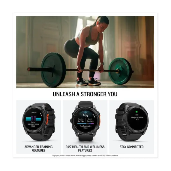 Be limitless. The fēnix® 8 multisport GPS smartwatch is built for serious athletes and outdoor adventurers who want to push beyond their limits. It features a bright 1.4” AMOLED display, stainless steel bezel and powerful built-in LED flashlight for after-dark visibility. A built-in speaker and mic enable you to make and take calls from your wrist when your watch is paired to your smartphone. Power up your body’s performance, endurance and resistance to injury with the latest in targeted strength training plans plus a full range of sport-specific workouts. Performance insights help manage your exertion and build stamina, while training readiness features show how much recovery time you need between workouts, based on 24/7 health and wellness monitoring of heart rate, respiration, stress, sleep and more (data presented is intended to be a close estimation of metrics tracked). Take to the trails with built-in ABC sensors and TopoActive maps that can be easily downloaded via Wi-Fi® connectivity. The dynamic round-trip routing feature helps simplify the planning of your runs or rides — letting you set your target distance and receive turn-by-turn directions that adjust to get you back to your start on schedule. Enjoy extended off-grid adventures with up to 16 days of battery life in smartwatch mode. Plus, a 40-meter dive rating and leakproof metal buttons let you reach new depths of adventure. Additional features include music storage, Garmin Pay™ contactless payments (with a supported country and payment network), smart notifications (compatible smartphone required) and more.