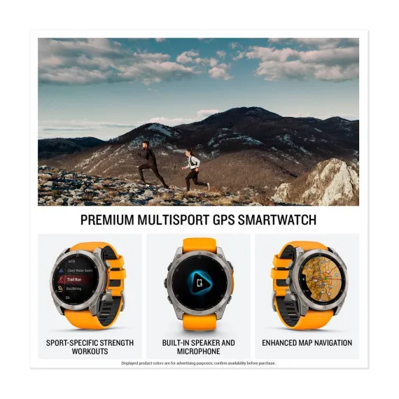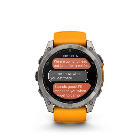 Be limitless. The fēnix® 8 multisport GPS smartwatch is built for serious athletes and outdoor adventurers who want to push beyond their limits. It features a bright 1.4” AMOLED display, stainless steel bezel and powerful built-in LED flashlight for after-dark visibility. A built-in speaker and mic enable you to make and take calls from your wrist when your watch is paired to your smartphone. Power up your body’s performance, endurance and resistance to injury with the latest in targeted strength training plans plus a full range of sport-specific workouts. Performance insights help manage your exertion and build stamina, while training readiness features show how much recovery time you need between workouts, based on 24/7 health and wellness monitoring of heart rate, respiration, stress, sleep and more (data presented is intended to be a close estimation of metrics tracked). Take to the trails with built-in ABC sensors and TopoActive maps that can be easily downloaded via Wi-Fi® connectivity. The dynamic round-trip routing feature helps simplify the planning of your runs or rides — letting you set your target distance and receive turn-by-turn directions that adjust to get you back to your start on schedule. Enjoy extended off-grid adventures with up to 16 days of battery life in smartwatch mode. Plus, a 40-meter dive rating and leakproof metal buttons let you reach new depths of adventure. Additional features include music storage, Garmin Pay™ contactless payments (with a supported country and payment network), smart notifications (compatible smartphone required) and more.