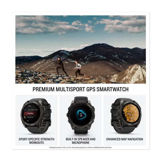 Be limitless. The fēnix® 8 multisport GPS smartwatch is built for serious athletes and outdoor adventurers who want to push beyond their limits. It features a bright 1.4” AMOLED display, stainless steel bezel and powerful built-in LED flashlight for after-dark visibility. A built-in speaker and mic enable you to make and take calls from your wrist when your watch is paired to your smartphone. Power up your body’s performance, endurance and resistance to injury with the latest in targeted strength training plans plus a full range of sport-specific workouts. Performance insights help manage your exertion and build stamina, while training readiness features show how much recovery time you need between workouts, based on 24/7 health and wellness monitoring of heart rate, respiration, stress, sleep and more (data presented is intended to be a close estimation of metrics tracked). Take to the trails with built-in ABC sensors and TopoActive maps that can be easily downloaded via Wi-Fi® connectivity. The dynamic round-trip routing feature helps simplify the planning of your runs or rides — letting you set your target distance and receive turn-by-turn directions that adjust to get you back to your start on schedule. Enjoy extended off-grid adventures with up to 16 days of battery life in smartwatch mode. Plus, a 40-meter dive rating and leakproof metal buttons let you reach new depths of adventure. Additional features include music storage, Garmin Pay™ contactless payments (with a supported country and payment network), smart notifications (compatible smartphone required) and more.