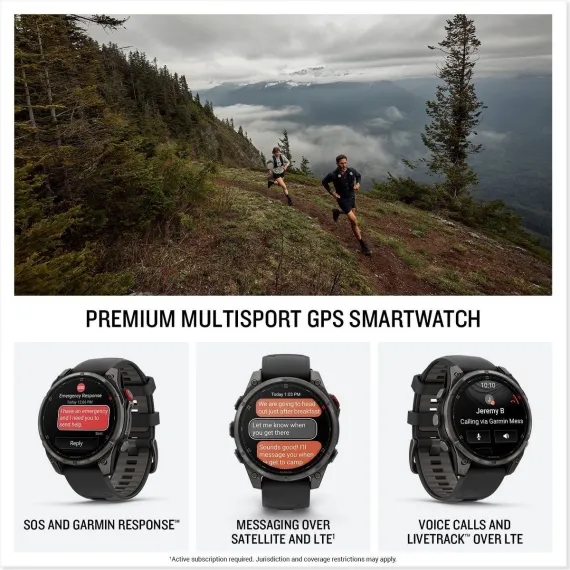 The fēnix® 8 Pro multisport GPS smartwatch is a breakthrough for serious runners, climbers, watersport athletes and others challenged to stay in contact where it’s impractical to carry a phone. This is the first Garmin smartwatch with built-in inReach® technology for satellite and LTE connectivity (active subscription required; coverage limitations may apply; some jurisdictions regulate or prohibit the use of satellite communication devices). Leave your phone behind, and access voice calls and LiveTrack™ location sharing when you’re connected to an LTE network. Or utilize two-way messaging and interactive SOS messaging capability during an outdoor adventure from either an LTE or satellite link — with emergency SOS support from the 24/7 Garmin ResponseSM coordination center. This rugged watch brings forward all the advanced fitness/strength training, health monitoring, mapping, round-trip routing and other key features from the fēnix 8 watch line along with a full range of sport-specific workouts. Premium touches include a bright 1.4" AMOLED display, titanium bezel, scratch-resistant sapphire lens and powerful built-in LED flashlight. It also has up to 15 days of battery life in smartwatch mode, a 40-meter dive rating, music storage and more.