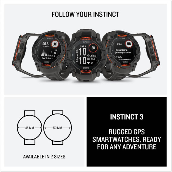 Instinct® 3 is the rugged 45 mm GPS smartwatch with a 0.9” display, built-in flashlight and unlimited battery life in smartwatch mode with solar charging (assumes all-day wear with 3 hours per day outside in 50,000 lux conditions). With bolted construction, a metal-reinforced bezel and scratch-resistant lens, it can take on your toughest adventures. It’s engineered to MIL-STD-810 standards for thermal and shock resistance and is also 10 ATM water-rated. To keep you on track, the Instinct 3 smartwatch includes a built-in 3-axis compass and barometric altimeter. Plus, multi-band GPS with SatIQ™ technology delivers superior positioning while also optimizing battery life. Its 24/7 health and wellness features keep you connected to your body with heart rate tracking, advanced sleep monitoring, Pulse Ox and more (this is not a medical device, and data presented is intended to be a close estimation of metrics tracked; Pulse Ox not available in all countries). Instinct 3 also includes Garmin Pay™ contactless payments (with a supported bank).