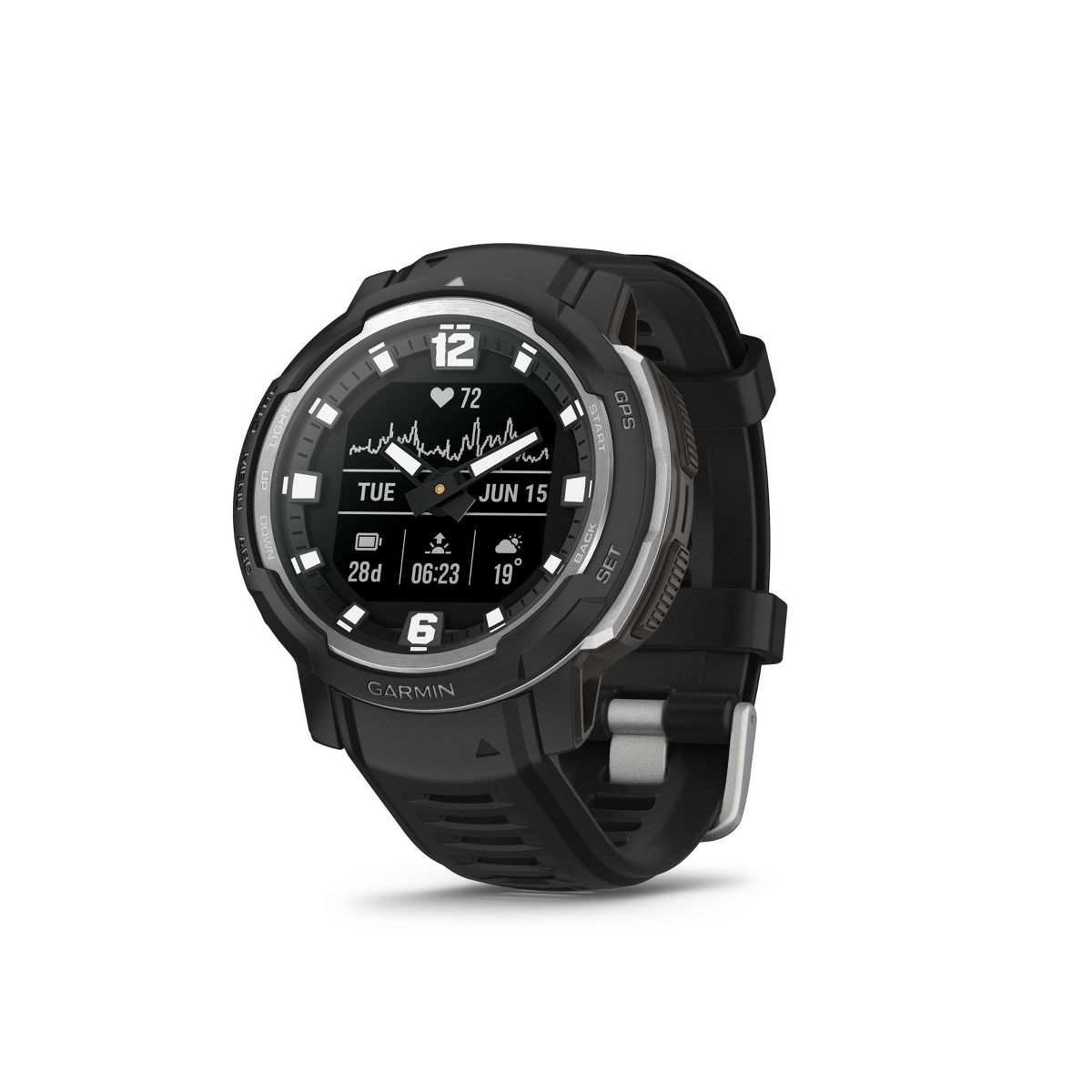 Contradict the common with Instinct® Crossover. This rugged hybrid GPS smartwatch provides a classic analog experience with advanced smart functionality and high-resolution digital screen. Built-in RevoDrive™ technology delivers accurate analog timekeeping in even the most demanding environments. Train your way — indoors or out — with built-in sports apps, including everything from strength training to running to mountain biking. With 24/7 health monitoring, you can keep up with energy levels, stress, sleep and more (data presented is intended to be a close estimation of metrics tracked). Never miss a text — or anything else — with notifications right on your wrist from your compatible Android™ or Apple® smartphone. With a supported country and payment network, forget your cash and cards and pay from the Instinct Crossover smartwatch with Garmin Pay™ contactless payments. With its next-level battery life, you won’t have to take it off to charge every night — in fact, you can get up to 28 days (and nights) in smartwatch mode.