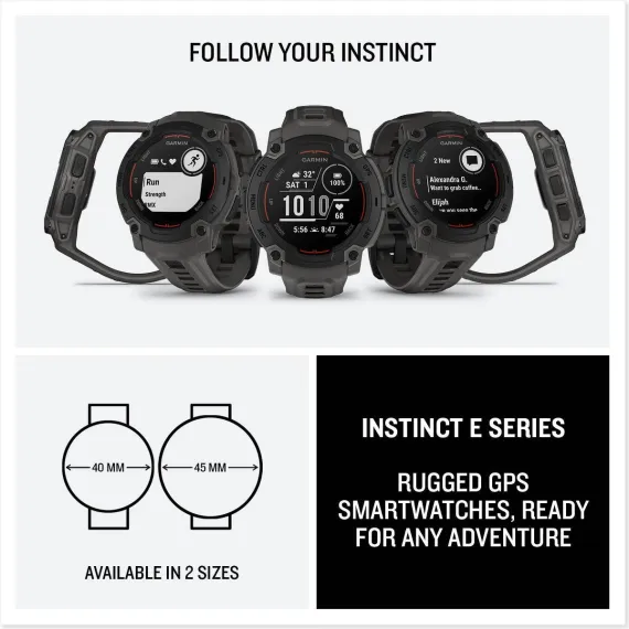 Instinct® E is the supertough 45 mm smartwatch that gets up to 16 days of battery life. It includes essential features such as smart notifications and Connect IQ™ Store compatibility. It also features 24/7 health and wellness tracking with wrist-based heart rate, advanced sleep monitoring, Pulse Ox and more (this is not a medical device, and data presented is intended to be a close estimation of metrics tracked; Pulse Ox not available in all countries). With its high-strength case and scratch-resistant lens, the Instinct E smartwatch can take on your toughest adventures. It’s engineered to MIL-STD-810 for thermal and shock resistance and is also 10 ATM water-rated. Plus, it includes a 3-axis compass, barometric altimeter and multi-GNSS to keep you on track when you’re off the grid.