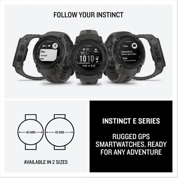 Instinct® E is the supertough 45 mm smartwatch that gets up to 16 days of battery life. It includes essential features such as smart notifications and Connect IQ™ Store compatibility. It also features 24/7 health and wellness tracking with wrist-based heart rate, advanced sleep monitoring, Pulse Ox and more (this is not a medical device, and data presented is intended to be a close estimation of metrics tracked; Pulse Ox not available in all countries). With its high-strength case and scratch-resistant lens, the Instinct E smartwatch can take on your toughest adventures. It’s engineered to MIL-STD-810 for thermal and shock resistance and is also 10 ATM water-rated. Plus, it includes a 3-axis compass, barometric altimeter and multi-GNSS to keep you on track when you’re off the grid.