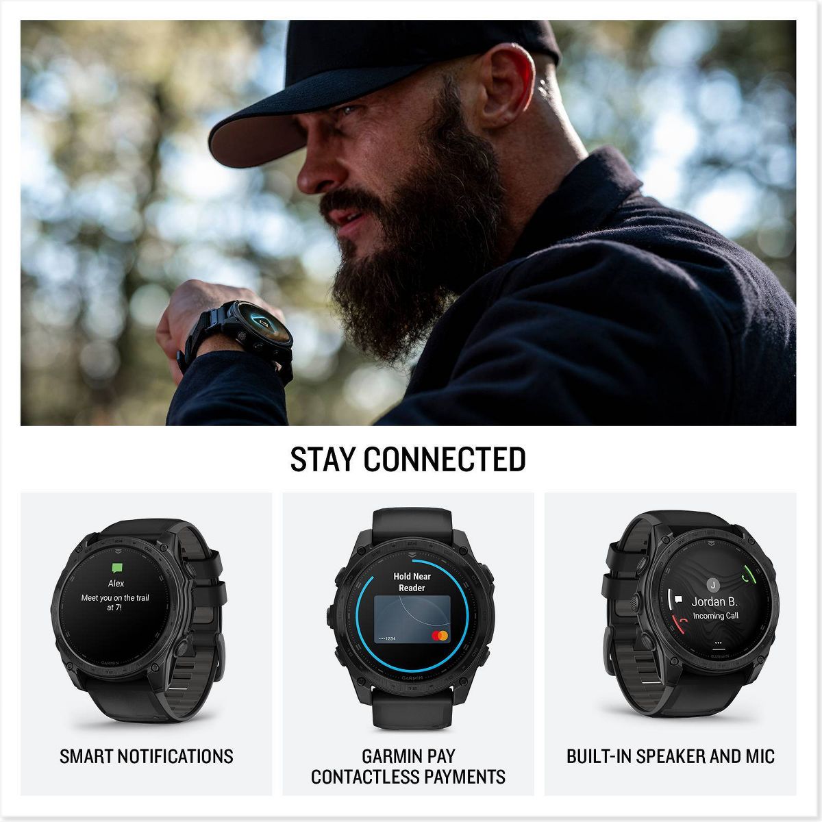 Rise above with tactix® 8. It’s the ultimate tactical smartwatch, featuring a stunning AMOLED display, titanium bezel, sapphire lens and a 40-meter dive rating. Pair with your smartphone for on-wrist calling with the built-in speaker and mic. Dedicated tactical features include a rucking activity and preloaded Applied Ballistics® solver along with a jumpmaster activity, waypoint projection, stealth mode, kill switch and more. Guide the mission with a built-in LED flashlight. Train like never before with strength training plans, sport-specific workouts and daily suggested strength workouts for runners and cyclists. Navigate the outdoors with superior positioning accuracy, thanks to multi-band GPS with SatIQ™ technology plus built-in sensors for the 3-axis compass, gyroscope and barometric altimeter. Push harder with up to 16 days of battery life in smartwatch mode.