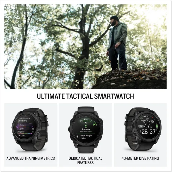 Rise above with tactix® 8. It’s the ultimate tactical smartwatch, featuring a stunning AMOLED display, titanium bezel, sapphire lens and a 40-meter dive rating. Pair with your smartphone for on-wrist calling with the built-in speaker and mic. Dedicated tactical features include a rucking activity and preloaded Applied Ballistics® solver along with a jumpmaster activity, waypoint projection, stealth mode, kill switch and more. Guide the mission with a built-in LED flashlight. Train like never before with strength training plans, sport-specific workouts and daily suggested strength workouts for runners and cyclists. Navigate the outdoors with superior positioning accuracy, thanks to multi-band GPS with SatIQ™ technology plus built-in sensors for the 3-axis compass, gyroscope and barometric altimeter. Push harder with up to 29 days of battery life in smartwatch mode.
