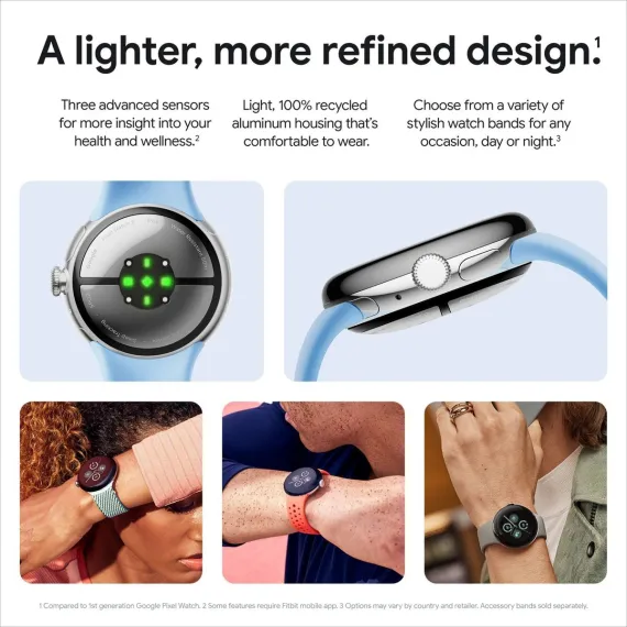 *Works with most phones running Android 9.0 or newer and requires a Google Account, Google Pixel Watch app and internet access. Some features require a Fitbit mobile app and/or a paid subscription. Google apps and services are not available in all countries or languages. See g.co/pixelwatch/specs for technical and device specifications. Compared to Google Pixel Watch (1st gen) with always-on display.