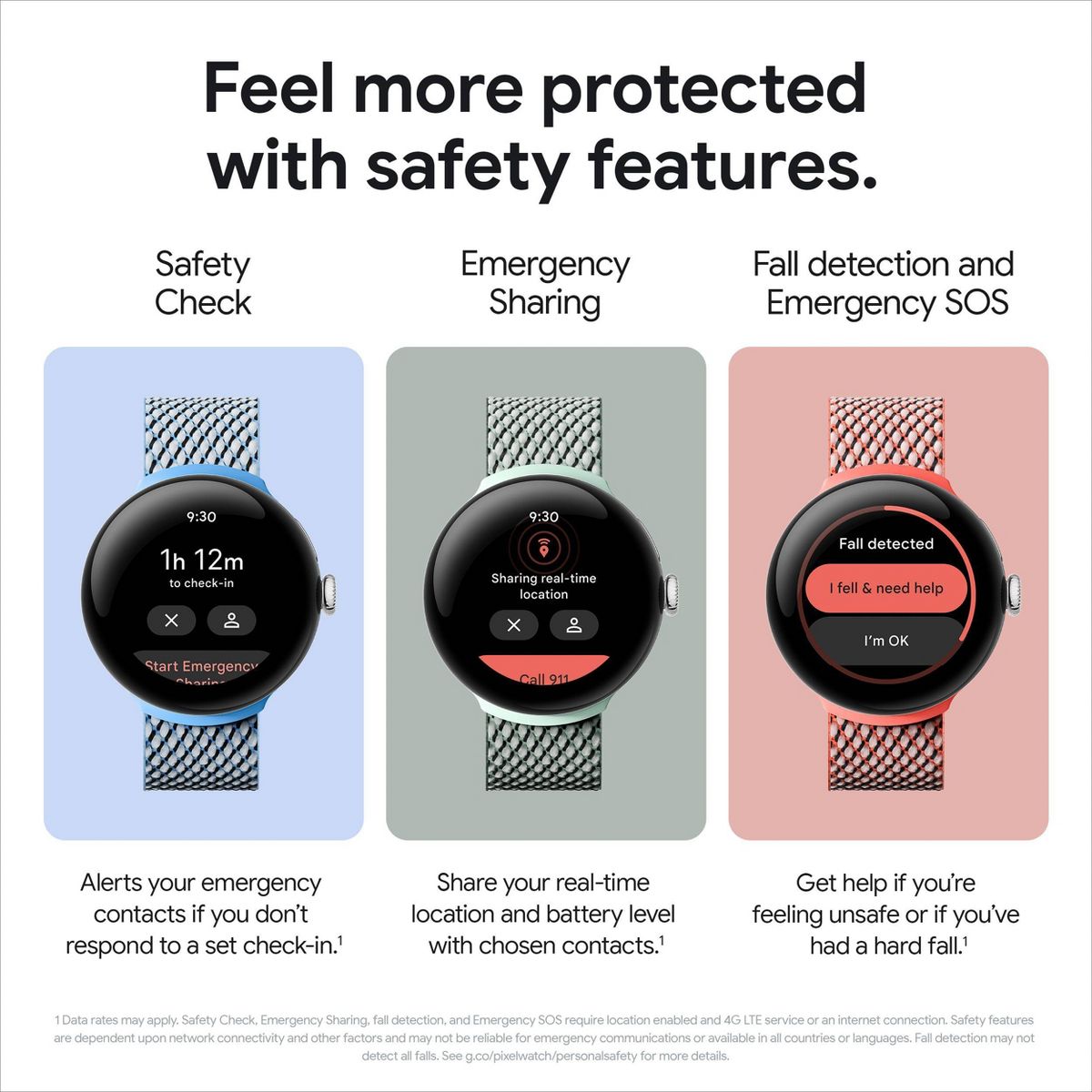 ********Data rates may apply. Safety check requires location enabled and 4G LTE service or an internet connection. Safety check is dependent upon network connectivity and other factors and may not be reliable for emergency communications or available in all countries or languages. See g.co/pixelwatch/personalsafety for more details.