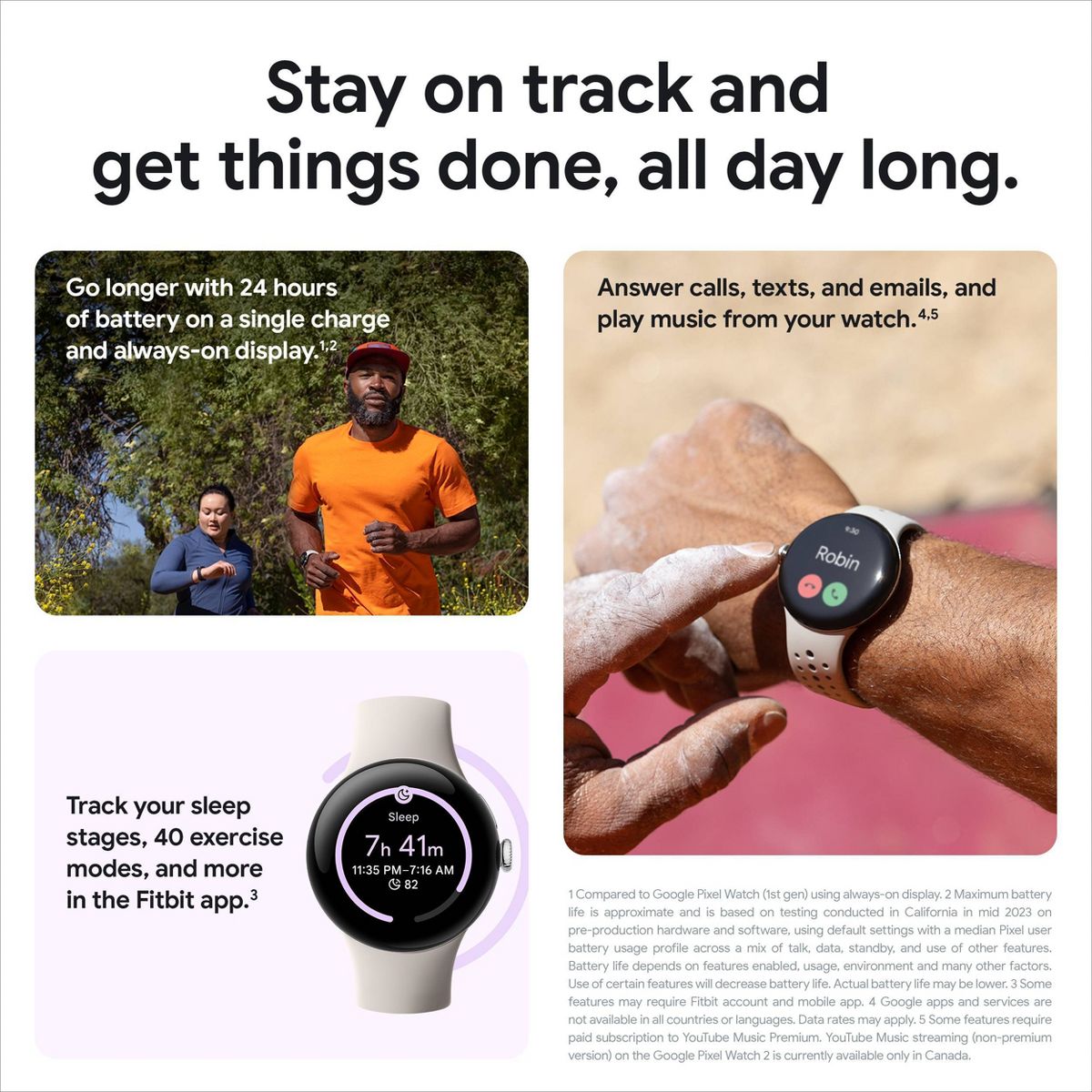 Meet the Google Pixel Watch 2, engineered by Google with the best of Fitbit.* Understand your health and fitness with Fitbit’s most advanced heart rate tracking.**** See the best of Google at a glance, including Gmail and Calendar, and get peace of mind from personal safety features.* And keep going with even longer battery life.***