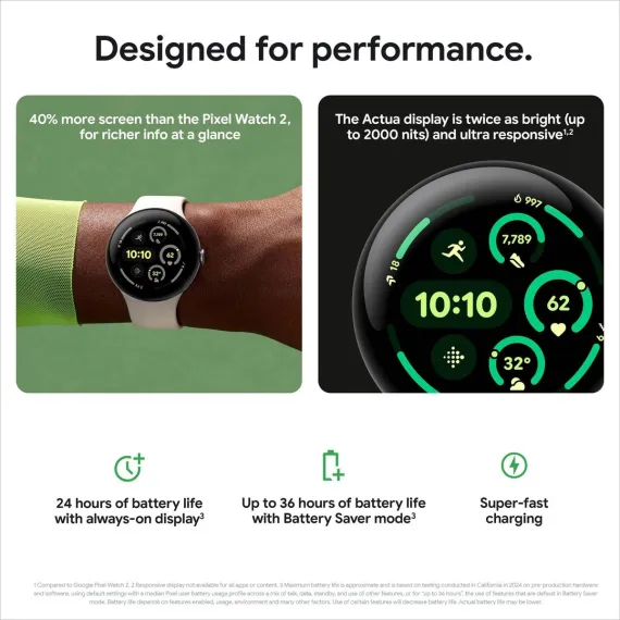 The Google Pixel Watch 3 is designed for performance.¹ The cutting-edge Actua display is bigger, brighter, and ultra responsive.² Beat your best times with advanced running features from Fitbit, then use all-new readiness and cardio load tracking to balance rest. And stay on top of your day with help from Google.