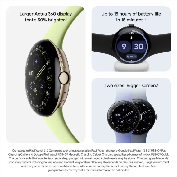 *Compared to Pixel Watch 3. Google apps may not be available in all countries or languages. Google Pixel Watch 4 works with most phones running on Android 11.0 or newer. Requires Google Account and Google Pixel Watch app. Some features require a Fitbit mobile app and/or Fitbit Premium membership. See g.co/pixelwatch/specs for technical and device specifications. Battery life depends on features enabled, usage, environment and many other factors. Use of certain features will decrease battery life. Actual battery life may be lower. See g.co/pixelwatch/batteryhealth for more information on battery life. Compared to previous generation Pixel Watch chargers (Google Pixel Watch (2 & 3) USB-C® Fast Charging Cable and Google Pixel Watch USB-C® Magnetic Charging Cable). Charging speed based on use of in-box USB-C® Quick Charge Dock with 30W adapter (sold separately) plugged into a wall outlet. Actual results may be slower. Charging speed depends upon many factors including battery age and ambient temperature.