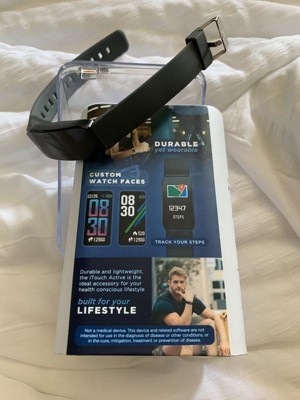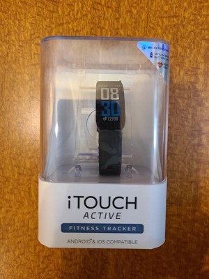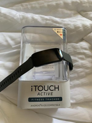 iTouch Active Smartwatch Fitness Tracker, Heart Rate, Step Counter, Sleep Monitor, Notifications, Waterproof for Men and Ladies, Compatible with iPhone and Android. 23.4 x 44 mm plastic rectangular case with digital dial. 12.7 mm case and 18 mm wide strap including a buckle strap. Take an elegant approach to fitness with the iTouch fitness tracker. The sleek, rectangle case gives you a classic look while the advanced technology allows you to upgrade your workout with 4 multi sports modes and 4 workout modes! Our watch is built to last, with a durable display that is scratch resistant. Features heart rate monitor, pedometer and tracks your calories burned with ease and stay on top of notifications, thanks to the many functions of the iTouch fitness tracker. You can also track your sleep patterns, battery indicator and do so much more, all with this super-stylish smartwatch. Don't worry about this watch dying in the middle of your run or while you are in your way to a meeting. With its long battery life, you can count on this watch all day.