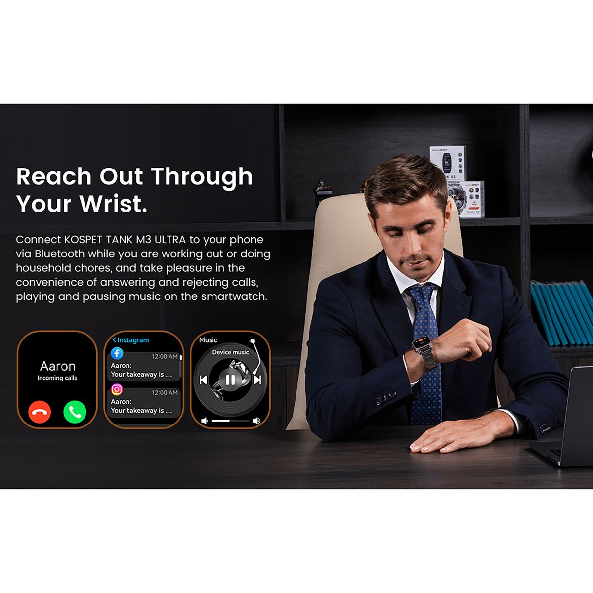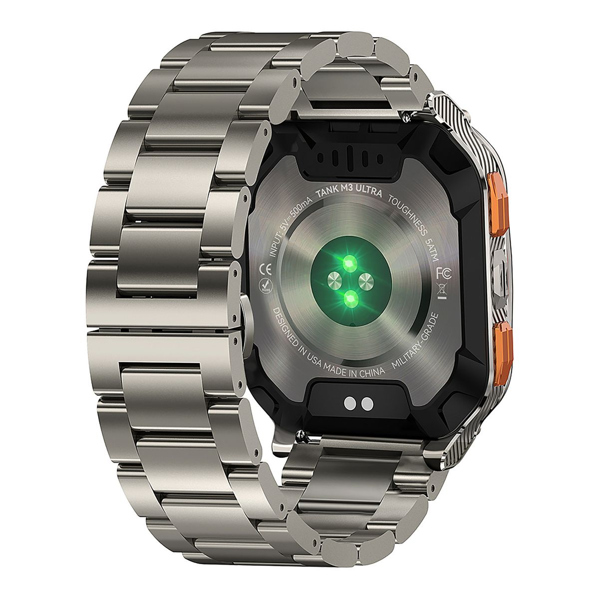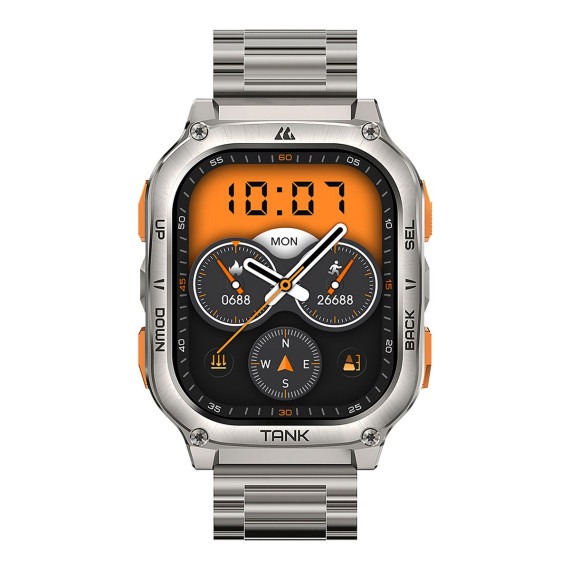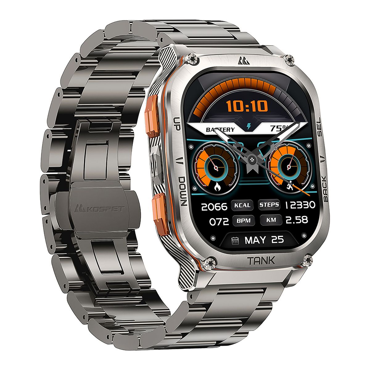 The KOSPET® TANK M3 Ultra Special Edition is a high-performance rugged smartwatch with dual-band GPS, 6 satellite-positioning systems, compass, barometric altimeter, G-sensor, 170+ sports modes, smart sleep tracking, and 5 ATM waterproofing. It combines pro-level tracking with a bold rectangular design with an always-on AMOLED display - ideal for outdoor training, swimming, and everyday adventure. This rugged smartwatch with its choice of stainless steel band or silicone band also features a stainless steel unibody design, Corning® Gorilla® Glass screen, and meets MIL-STD-810H standards.