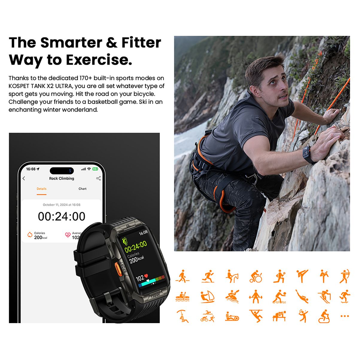 Built for outdoor adventure, the KOSPET® TANK X2 Ultra features an always-on AMOLED display, dual-band GPS with 6 satellite positioning systems, 170+ sports modes, built-in compass and barometric altimeter, Bluetooth® calling, and 5 ATM + IP69K waterproofing. With a tough design thanks to its stainless steel body, polycarbonate + 15% (fireproof) glass fiber bottom case material, and long battery life, it’s the ideal smartwatch for swimming, fitness, and rugged exploration.