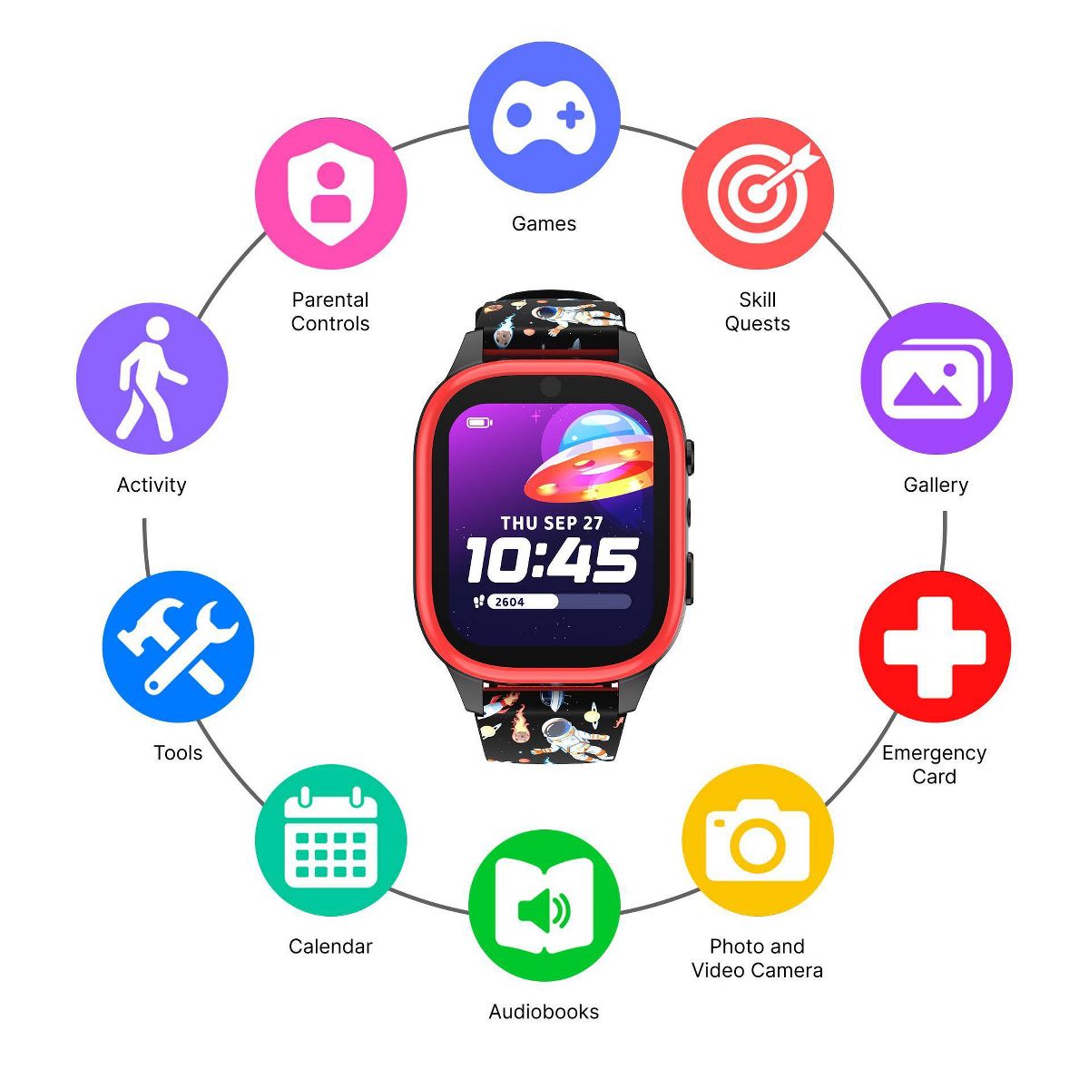 PLAYZOOM 4 is the ultimate smartwatch for kids ages 4–12, packed with educational fun, safety features, and creative tools—all in a durable, splash-proof design. With a large 1.83" color touchscreen, this smartwatch includes over 25 built-in games, audiobooks, and sing-along songs to keep kids entertained and engaged. A front-facing selfie camera, voice recorder, and custom watch faces encourage self-expression, while a step tracker helps promote active habits.