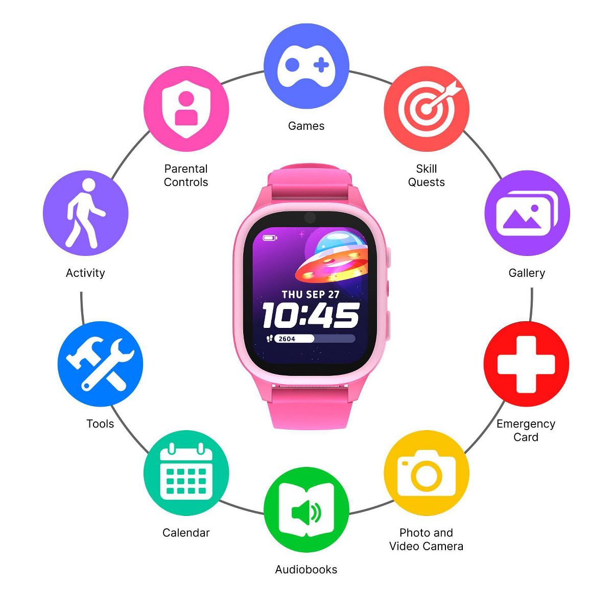 PLAYZOOM 4 is the ultimate smartwatch for kids ages 4–12, packed with educational fun, safety features, and creative tools—all in a durable, splash-proof design. With a large 1.83" color touchscreen, this smartwatch includes over 25 built-in games, audiobooks, and sing-along songs to keep kids entertained and engaged. A front-facing selfie camera, voice recorder, and custom watch faces encourage self-expression, while a step tracker helps promote active habits.