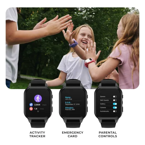 PLAYZOOM 4 is the ultimate smartwatch for kids ages 4–12, packed with educational fun, safety features, and creative tools—all in a durable, splash-proof design. With a large 1.83" color touchscreen, this smartwatch includes over 25 built-in games, audiobooks, and sing-along songs to keep kids entertained and engaged. A front-facing selfie camera, voice recorder, and custom watch faces encourage self-expression, while a step tracker helps promote active habits.