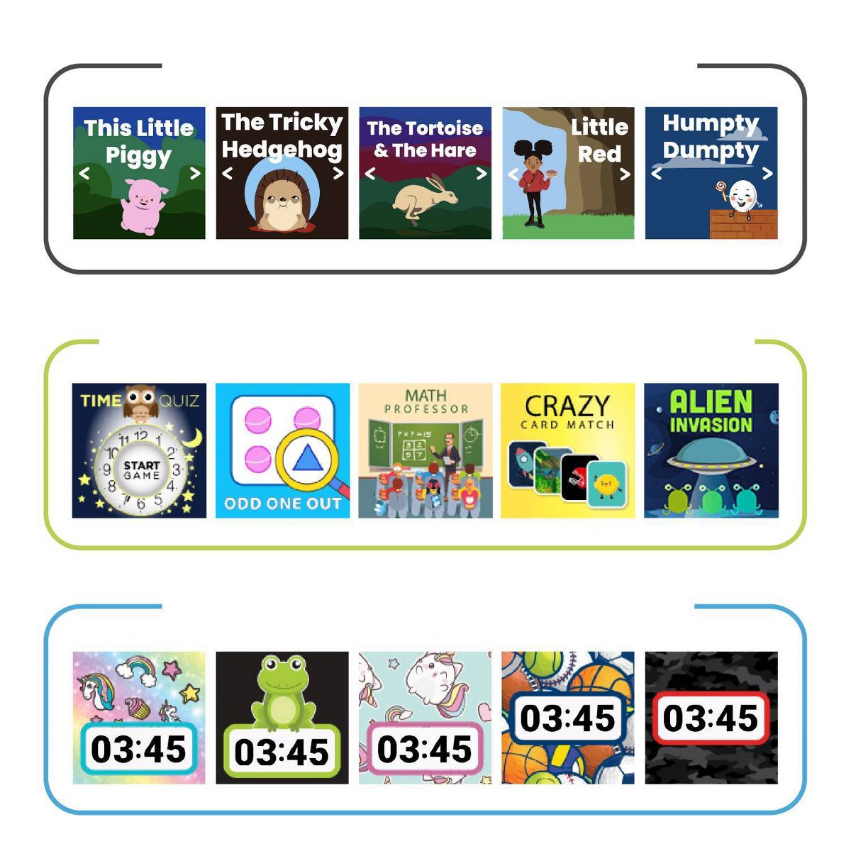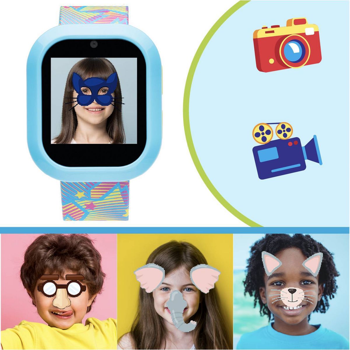 Playzoom V3 kids smartwatch & wireless headphones have amazing features, including fun selfie camera, voice recorder, photo effects MP3 player, audiobooks, stopwatch, alarm, timer and calendar. The wireless headphones have high-fidelity audio and Bluetooth technology for wireless audio streaming. Rechargeable battery offers 4 hours of play. Soft touch controls on ear cups to adjust volume and answer calls. Plush earpads and headband for perfect fit and long-lasting comfort. The watch does not connect to a cellular device and is kid safe!