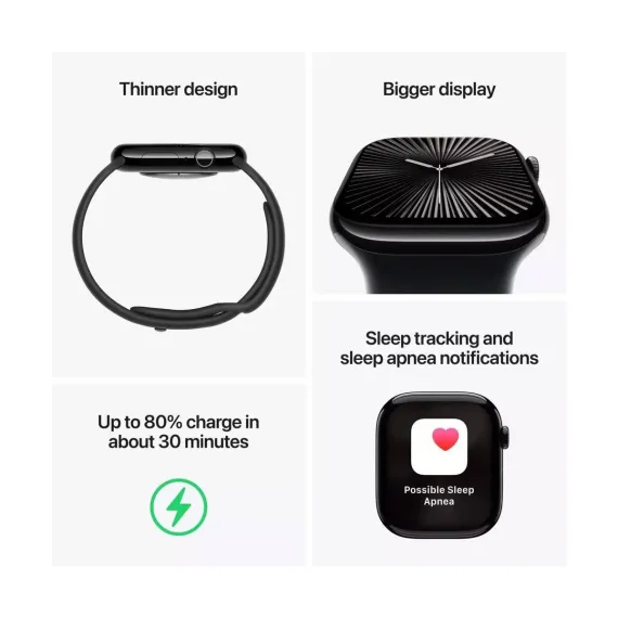 Meet Apple Watch Series 10. A bigger display with more screen area and a thinner, lighter design. Get advanced fitness and health features with Sleep Apnea Notifications,¹ plus faster charging.