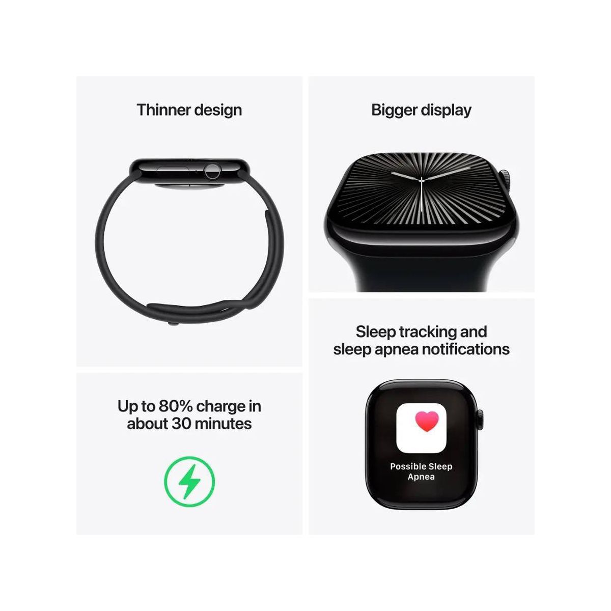 Meet Apple Watch Series 10. A bigger display with more screen area and a thinner, lighter design. Get advanced fitness and health features with Sleep Apnea Notifications,¹ plus faster charging.