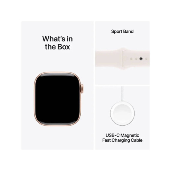⁵Charge times are from 0–80% and 0–100% using the included Apple Watch Magnetic Fast Charger to USB-C Cable. Testing conducted by Apple in August 2024 using preproduction Apple Watch Series 10 (GPS) and Apple Watch Series 10 (GPS + Cellular), each paired with an iPhone; all devices tested with prerelease software, Apple Watch Magnetic Fast Charger to USB-C Cable (Model A2515), and Apple 20W USB-C Power Adapter (Model A2305). Fast-charge testing conducted with drained Apple Watch units. Times measured from the appearance of the Apple logo as the unit started up. Charge time varies with region, settings, and environmental factors; actual results will vary.